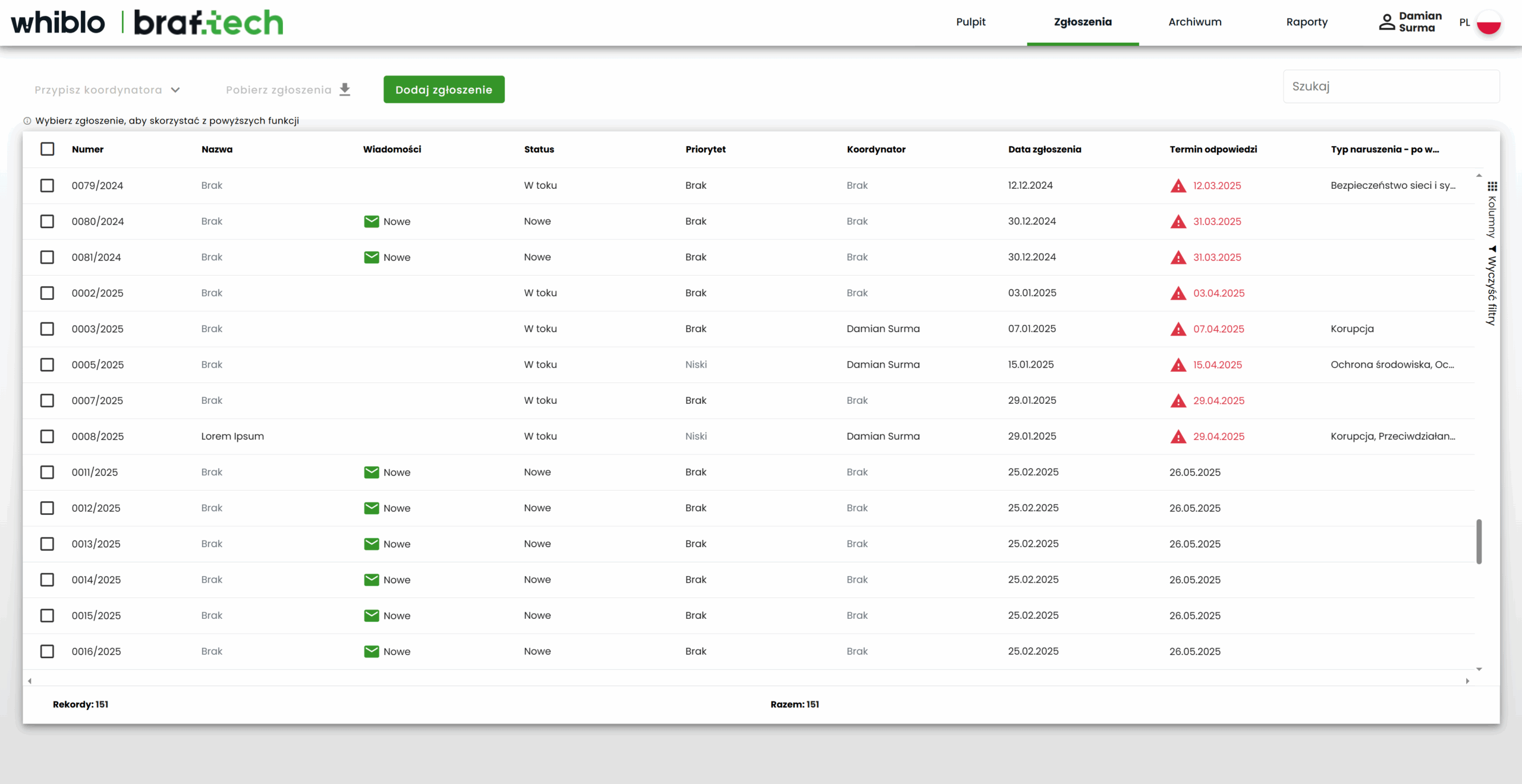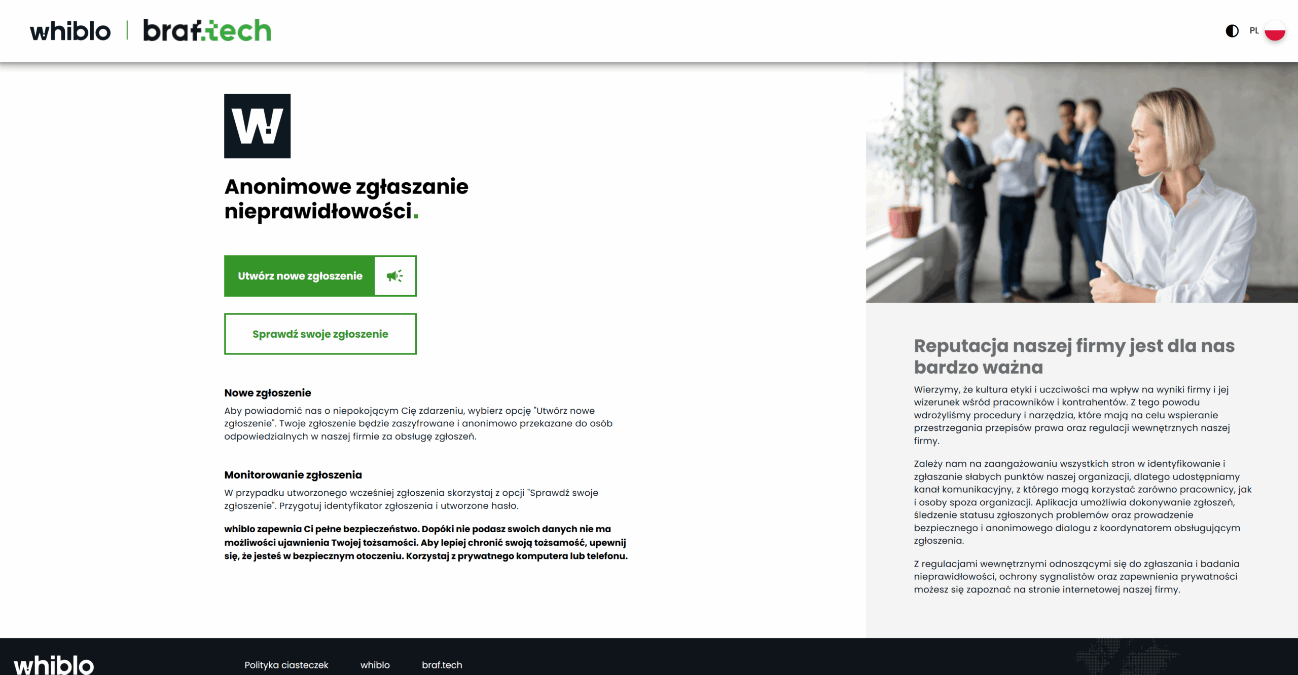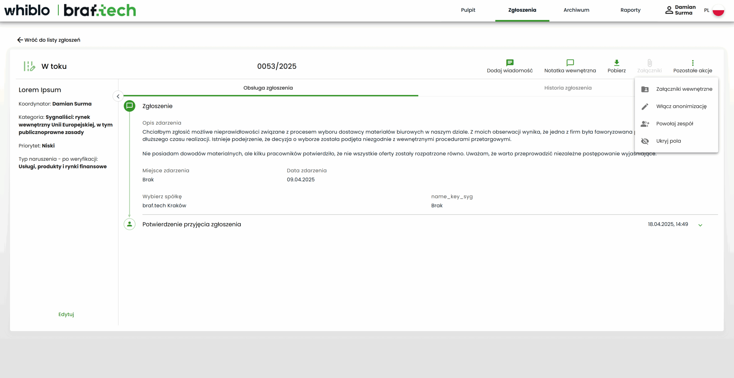 Wdrożono Whiblo – aplikację komponowaną na miarę organizacji z modułem anonimowej komunikacji, zaawansowaną walidacją zgłoszeń i dwustronnym systemem korespondencji z sygnalistą.